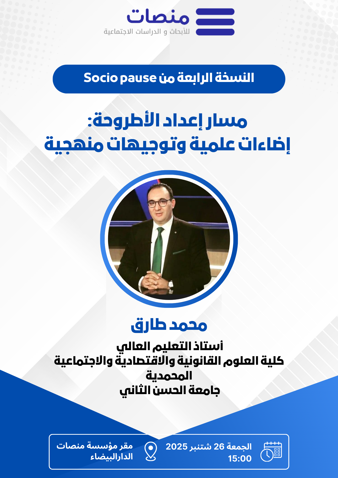 تعلن مؤسسة منصات للأبحاث والدراسات الاجتماعية عن تنظيم منتدى "المجتمع المدني العلمي بالمغرب: الهوية، التنظيم والآفاق"، والذي سينعقد يوم الجمعة 17 ماي 2024 بفندق كومبانيل بالدار البيضاء، ابتداءً من الساعة العاشرة صباحًا.