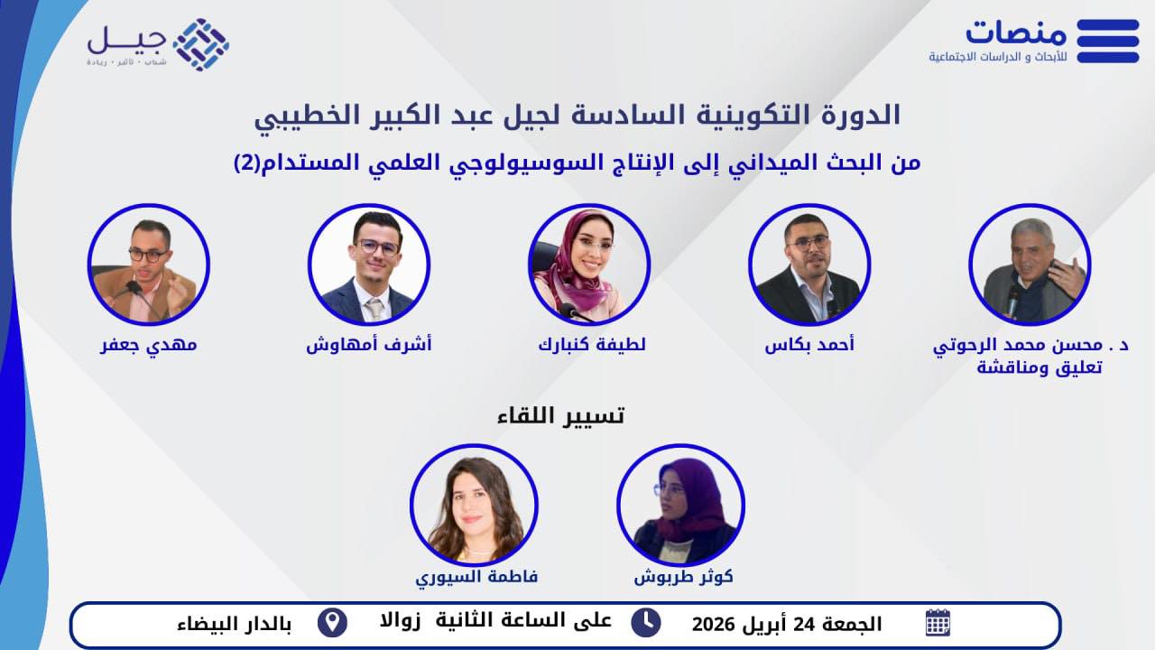 في إطار رهانها المستمر على تأهيل الباحثين الشباب وتعزيز كفاءاتهم العلمية والمنهجية في العلوم الإنسانية والاجتماعية، ولا سيما في مجال إعداد وكتابة أوراق السياسات، نظّمت مؤسسة منصات للأبحاث والدراسات الاجتماعية، بمدينة الرباط، ما بين 26 و28 دجنبر 2025، الدورة التكوينية الثالثة ضمن النسخة الرابعة من برنامج «جيل الريادي». وتحمل هذه الدورة اسم المفكر المغربي عبد الكبير الخطيبي، تكريمًا لإسهاماته البارزة في تجديد الفكر السوسيولوجي والنقدي بالمغرب.